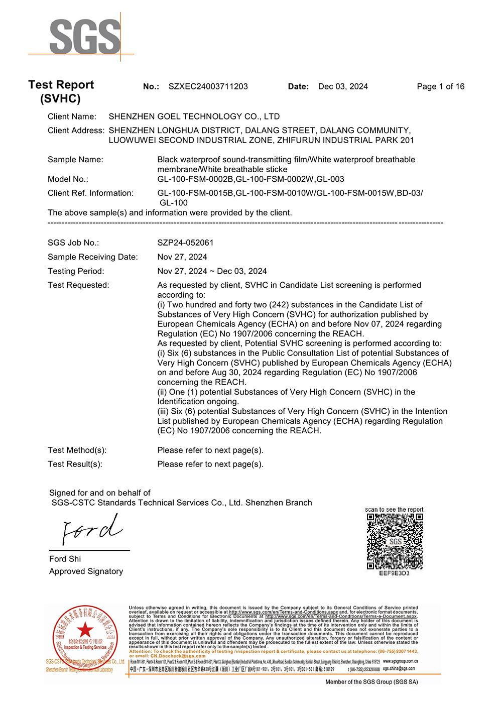 黑色防水透聲膜/白色防水透氣默默/白色透氣貼SGS檢測報告